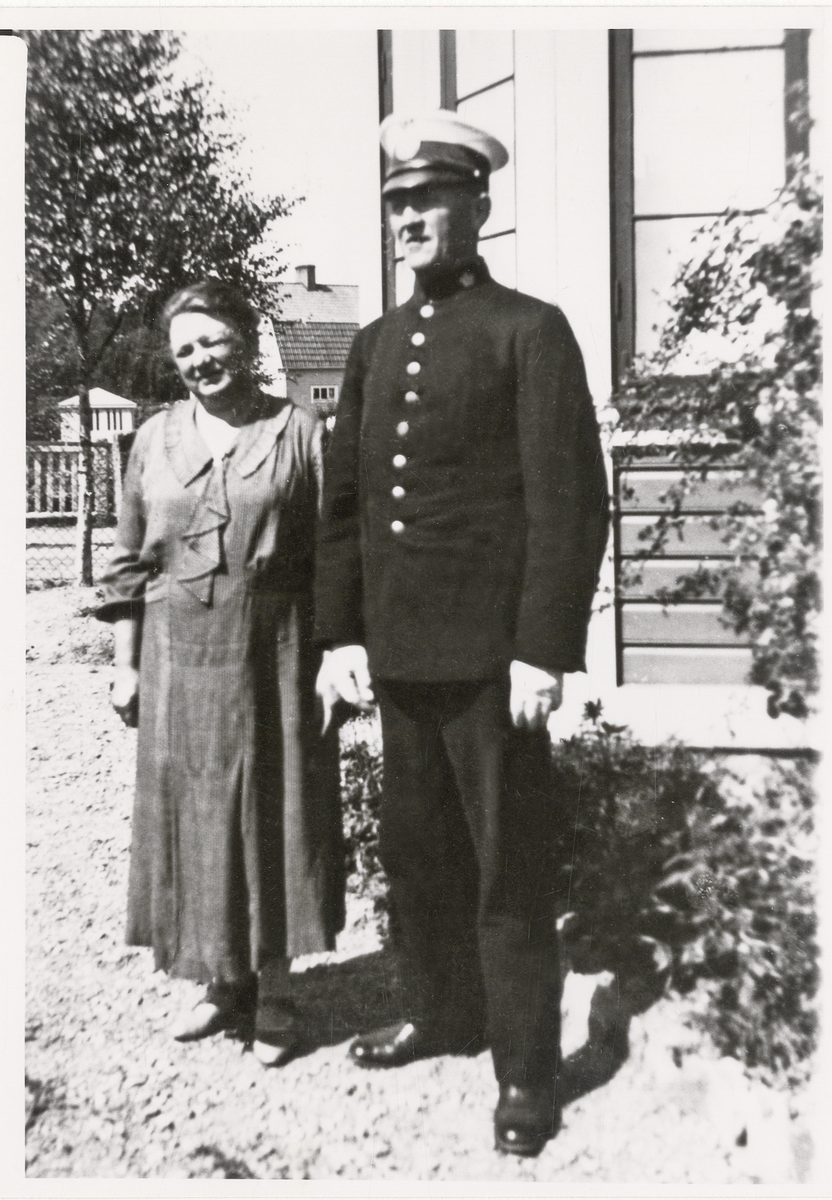 Poliskonstapel Per Ohlsson med hustru, i en trädgård någonstans i Alvesta ca 1930.