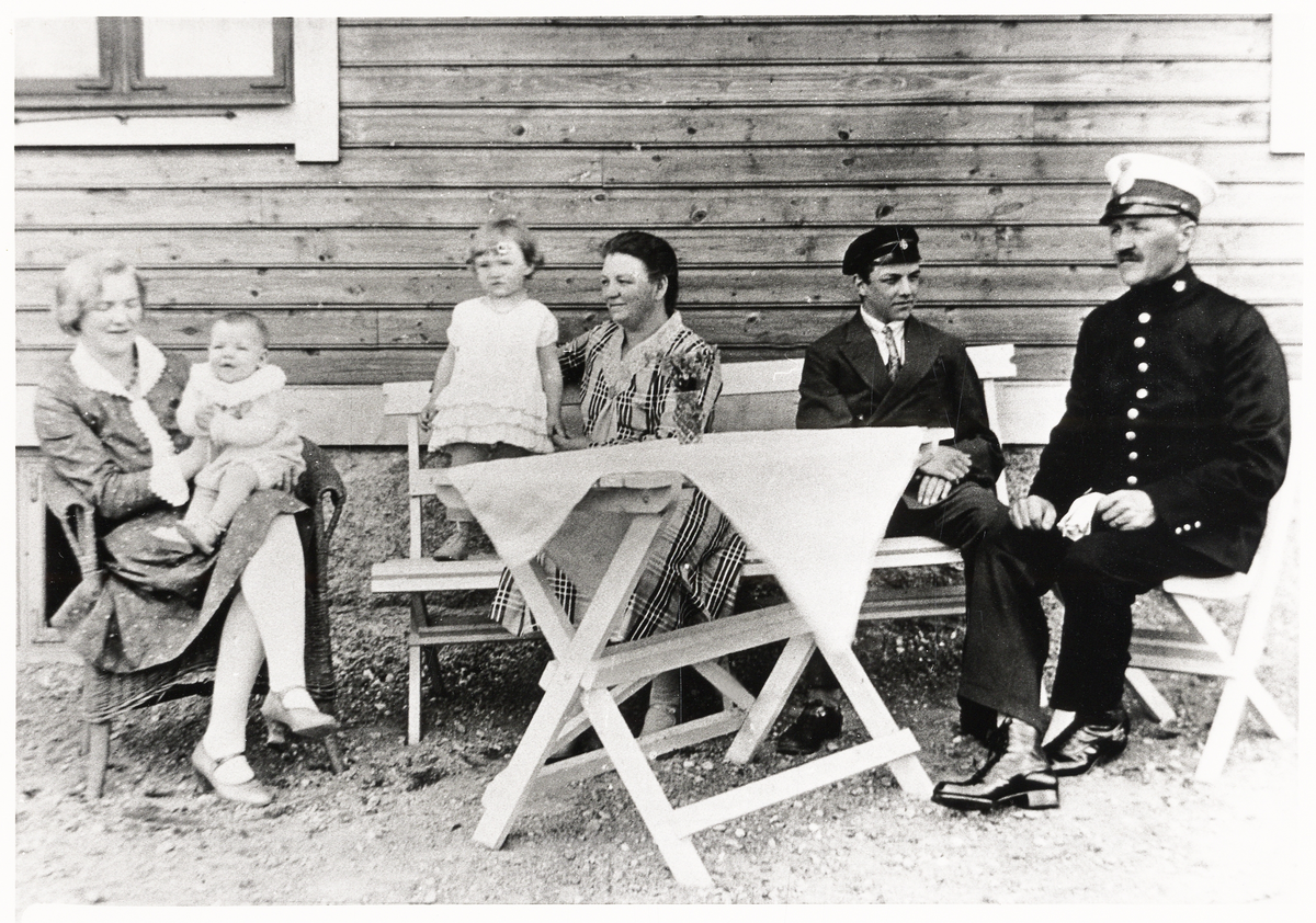 Poliskonstapel Per Ohlsson med familj i en trädgård i Alvesta, ca 1930.