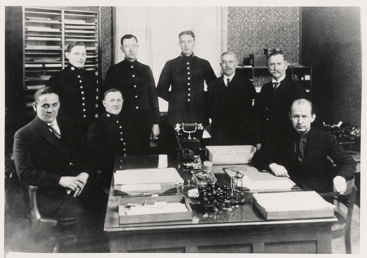 Fr.v.: Landsfiskal Gustaf Öhrstam, fjärdingsman O. Andersson, Alvesta, poliskonstapel Per Ohlsson, Alvesta, exekutor J. Johansson, Vislanda, poliskonstapel Erik Tollstern, Västra Torsås, fjärdingsman Axel Nilsson, Skatelöv, fjärdingsman O. M. Rosén, Blädinge och okänd landsfiskalsassistent.
