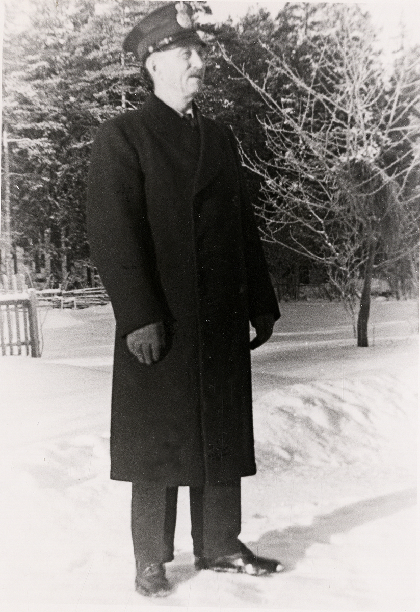 Fjärdingsman Karl Lilja, Lenhovda, i en snöig trädgård. ca 1930.
