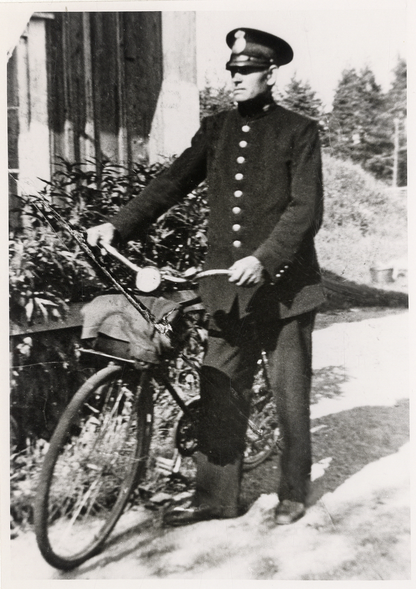 Gustaf Svensson, fjärdingsman i Slätthög, med cykel, ca 1925.