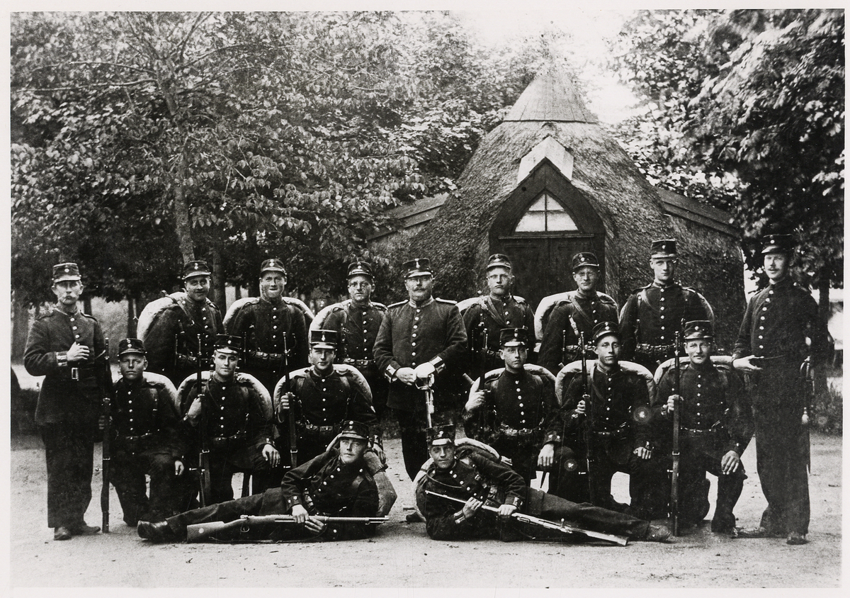 Blivande fjärdingsman Axel Spång längst t.v., , med några mannar utanför de omtalade hyddorna på Kronobergshed, ca 1890.