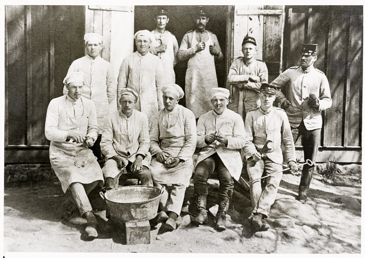 Korpral Axel Spång (blivande fjärdingsman), i dörröppningen tillsammans med kockar och kökshandräckning på Kronobergshed, ca 1890.