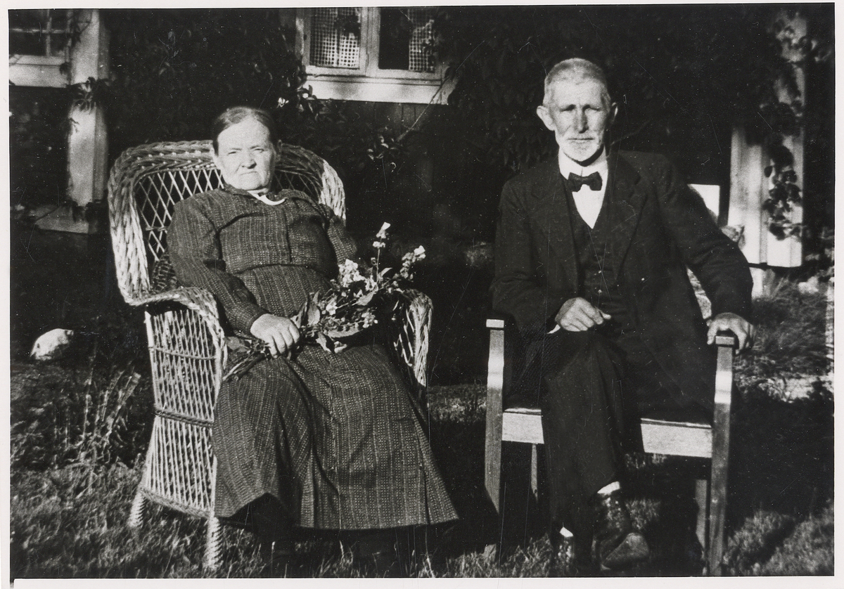Fjärdingsman Axel Spång, Vislanda, med fru Amanda, ca 1931, utanför familjens bostad, Hullingsved Södratorp.