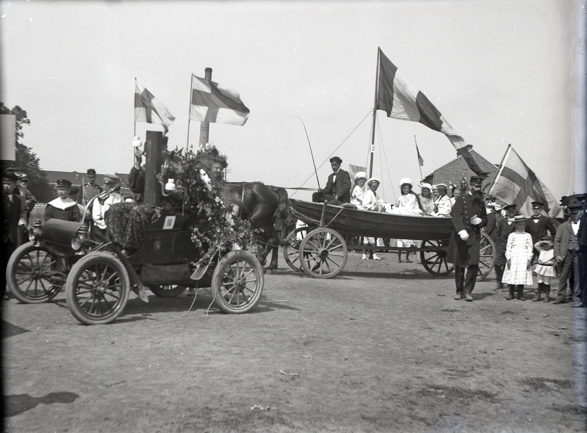 Förutom en stor eka, apterad som vagn, syns en Oldsmobile från cirka 1903.