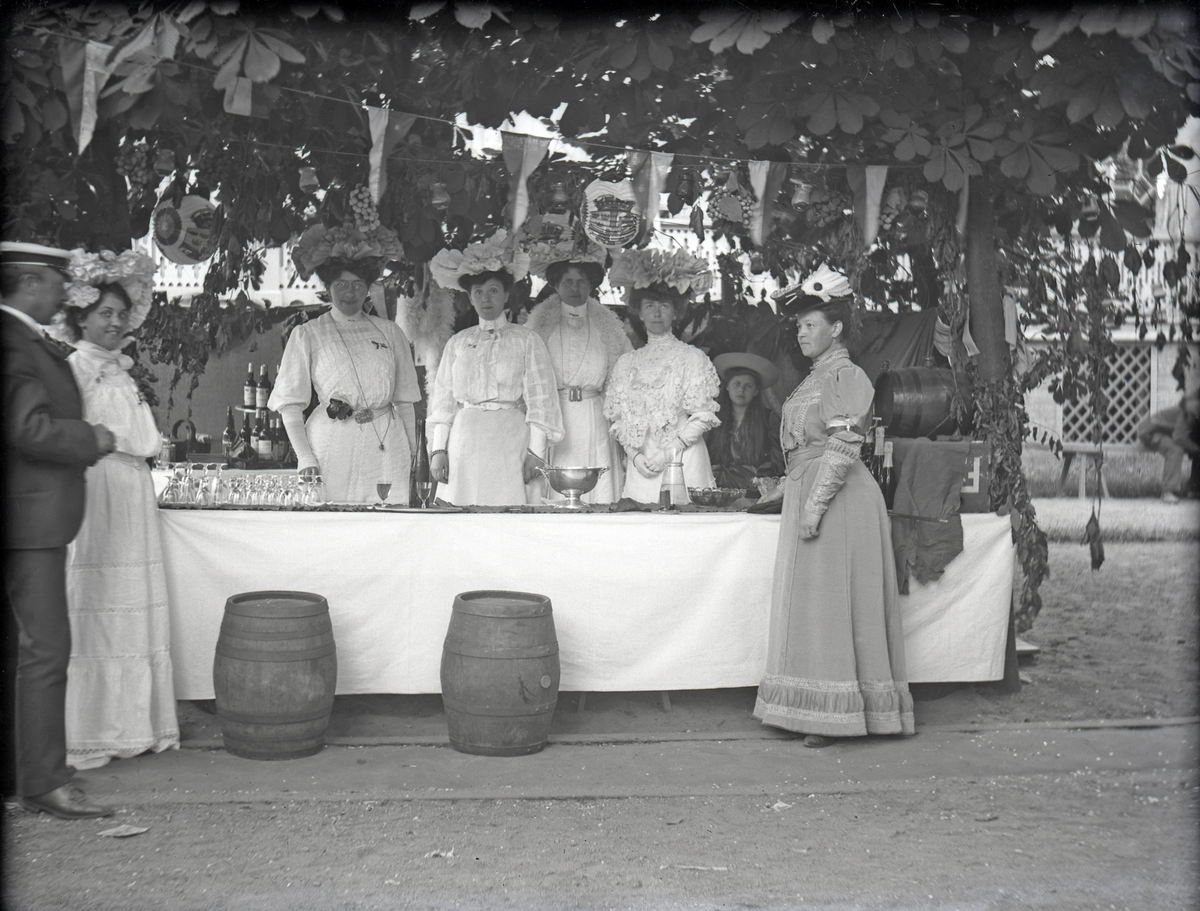 Några uppklädda societetsdamer har samlats vid ett serveringsstånd, där man av allt att döma kan få någon sorts bål eller likn.