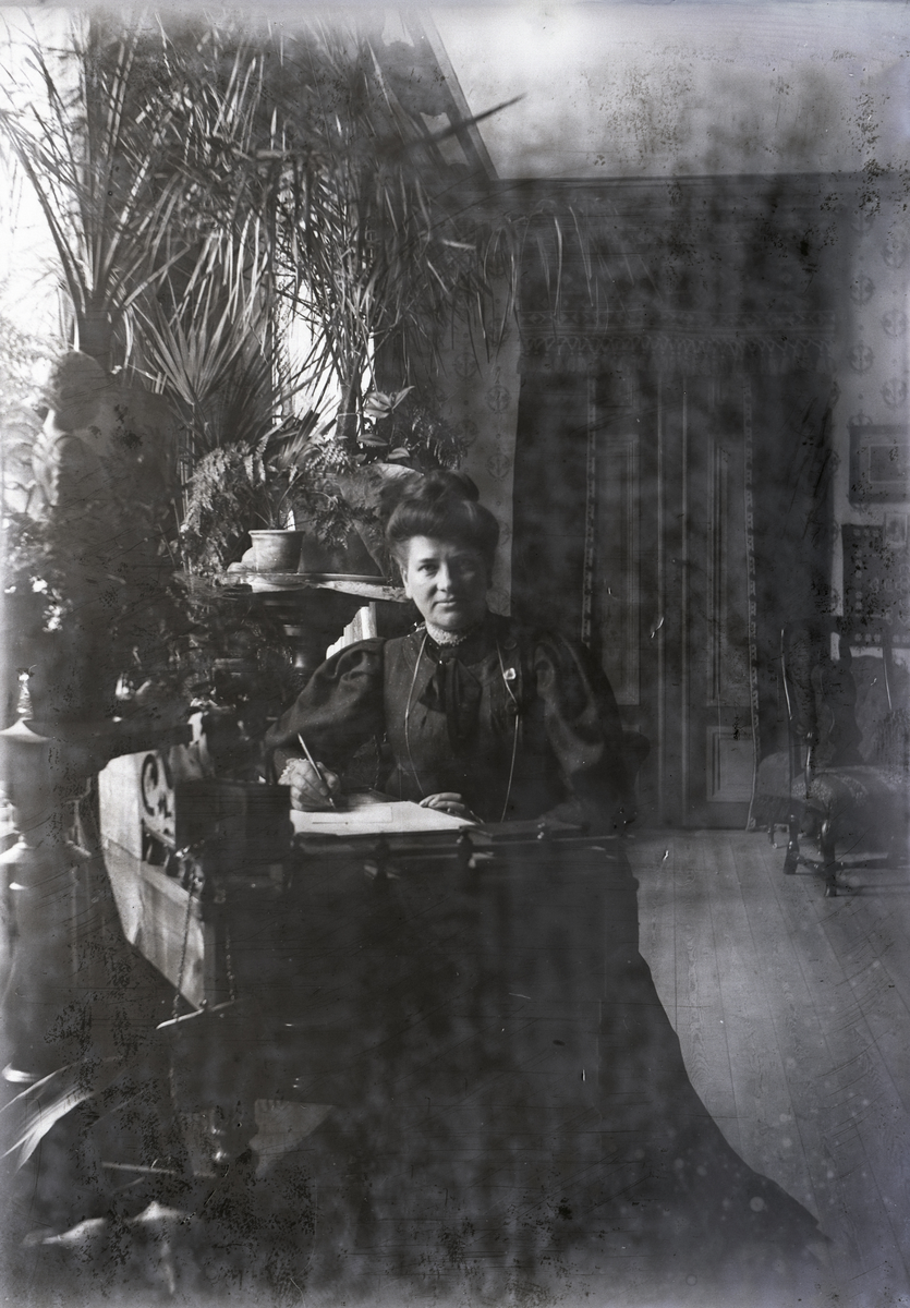 En kvinna sitter vid ett litet skrivbord, vid ett fönster.