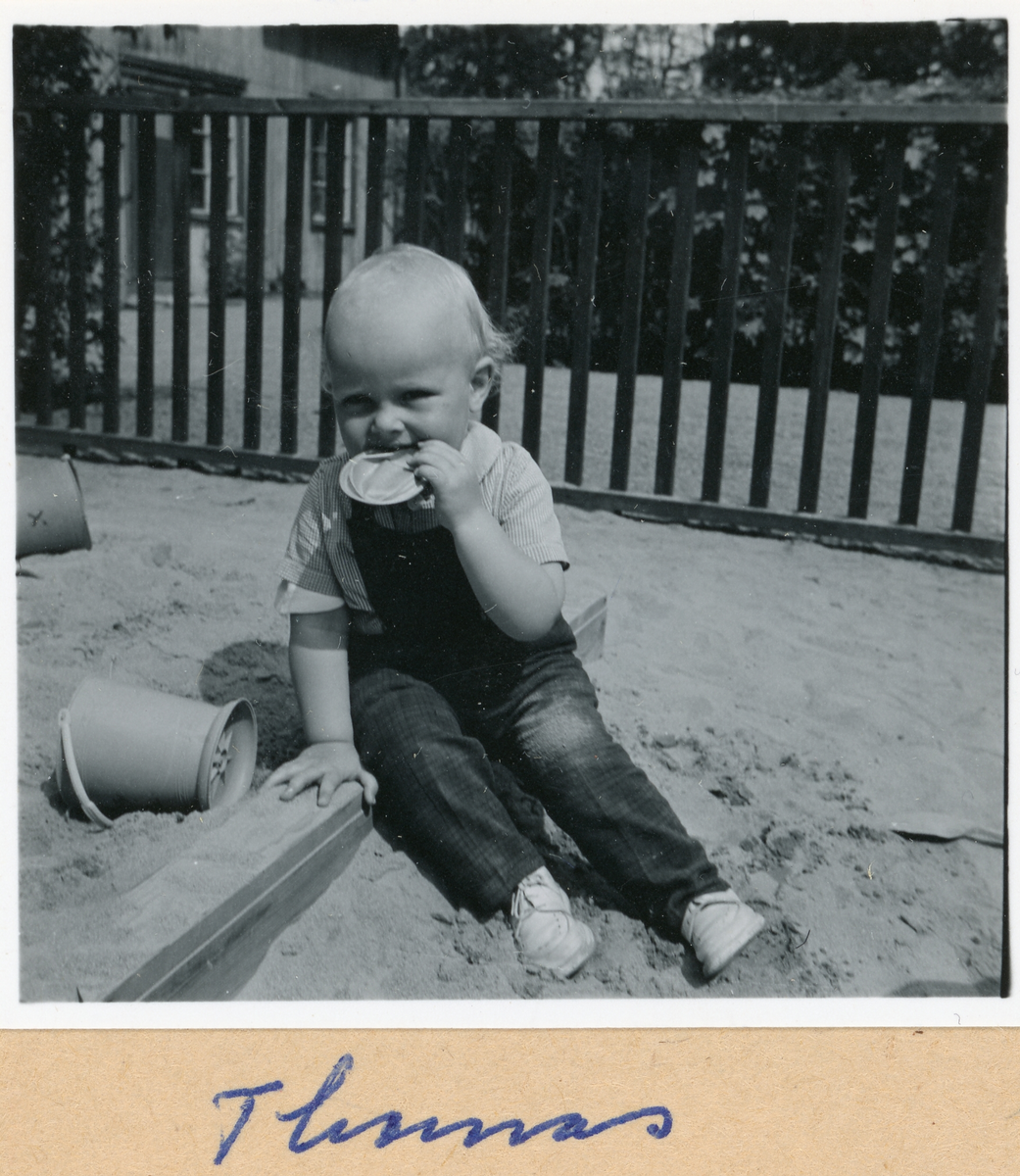 Bild på Thomas som leker i sandlådan, sommaren 1958.
