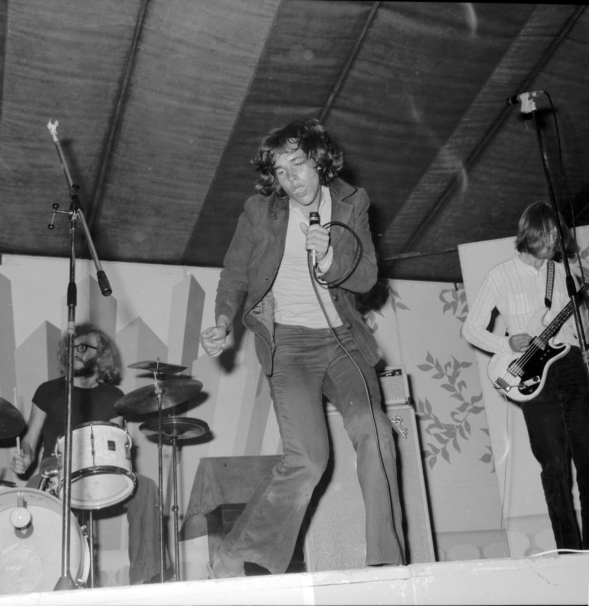 X-Natta. Juli 1972. Mora Träsk på scenen. Carlos Söderlund (trummor), Leif Walter (sång) och Sture Ekendahl (bas).
