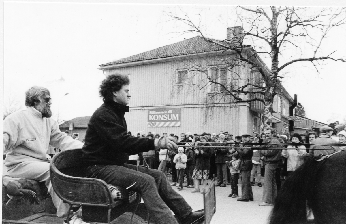 Titel: Åke Pettersson på torget i Brunn, Den 4-faldige världsmästaren på skidor (synskadade) förs i procession från sin bostad till torget i Brunn. Bo-Göran Skoglund vid tömmarna.