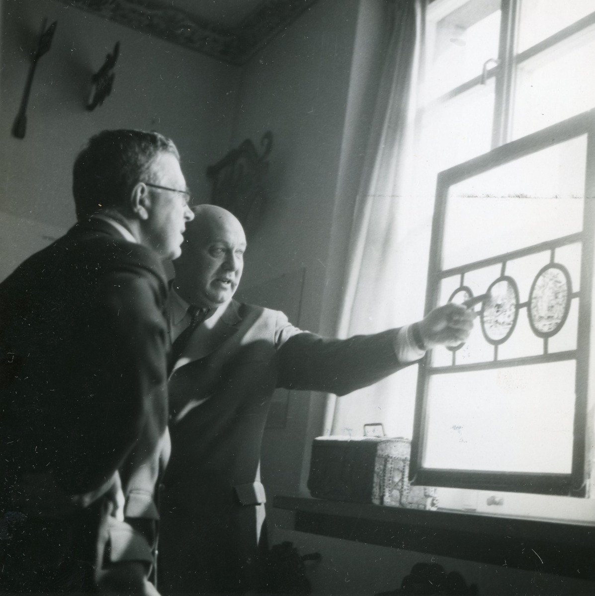 Intendent Philibert Humbla visar glasmålning för kung Gustav VI Adolf på Gävle Museum 1946.