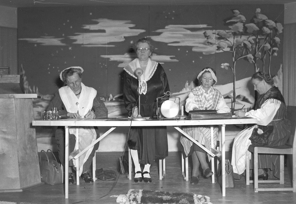 Husmodersföreningen, jubileumskongress på Folkets hus. Den 28 mars 1950. Kvinnor i folkdräkter runt ett bord.