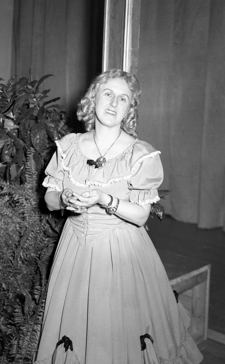 Husmodersföreningen, jubileumskongress på Folkets hus. Den 28 mars 1950. Kvinna i klänning.