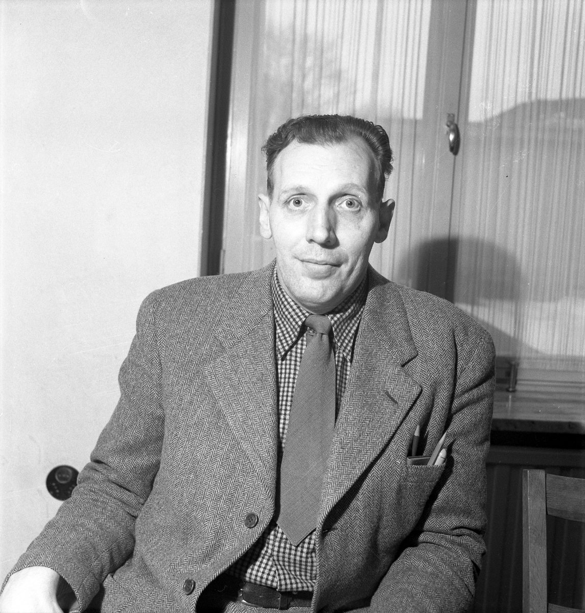 Arkitekt Per Olof Lefvert förevisar generalplanen. Stadsplaneutställningen den 13 mars 1950