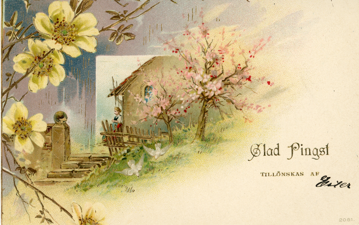 Brevkort adresserat till fröken Valborg....?! 1902. Motiv av en stuga och blommande träd. Text på framsidan: "Glad Pingst tillönskas af Ester".