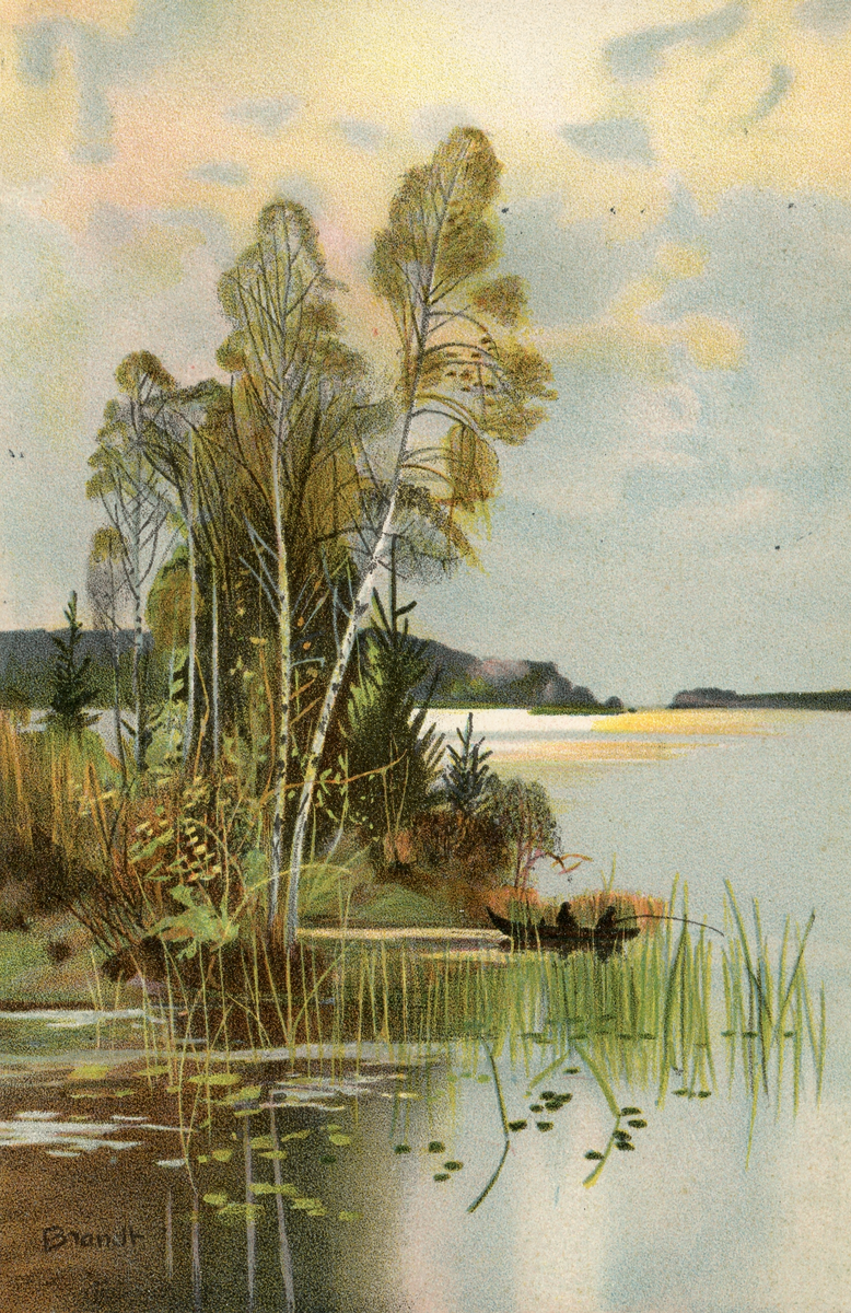 Brevkort adresserat till sjuksköterskan Amanda Palm, 1906. Motiv av en sjö med några i en eka som fiskar och björkar på land.