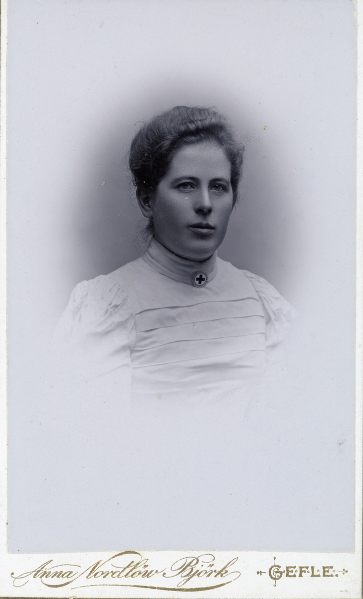 Porträtt av kvinnlig sjuksköterska med vårdbrosch.