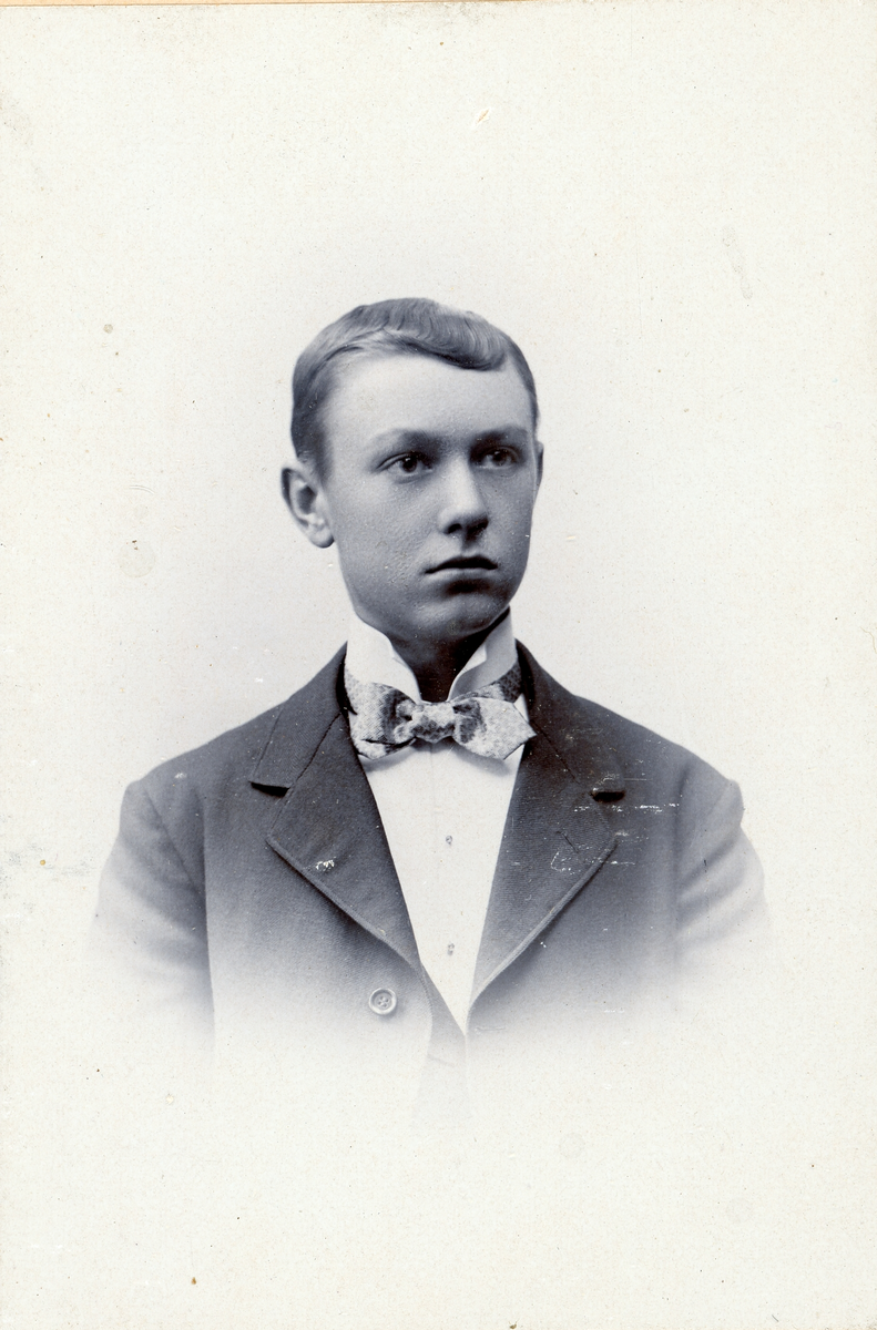 Titel: Porträtt av Oskar Palm? (enligt text vid kortet i albumet). Fotografiet sitter på ett utsmyckat kort, silvertryckt information på framsidan, "Mikado" samt blommor och blad