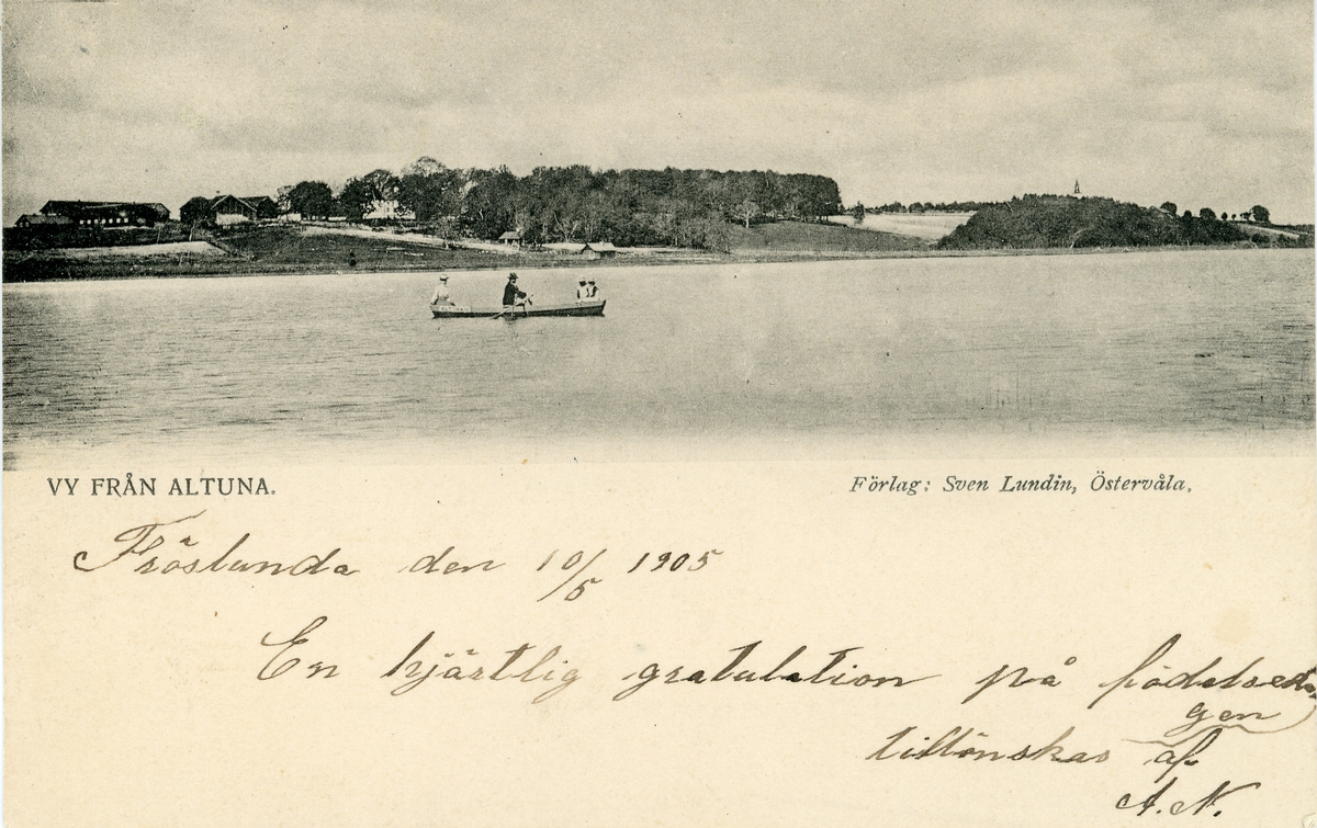 Titel: Brevkort adresserat till sjuksköterskan Amanda Palm. Motiv av vy från Altuna med personer ute i en eka och strandkant med byggnader i bakgrunden. Text på framsidan: "Fröslunda den 10/5 1905. En hjärtlig gratulation på födelsdagen tillönskas af A. N".