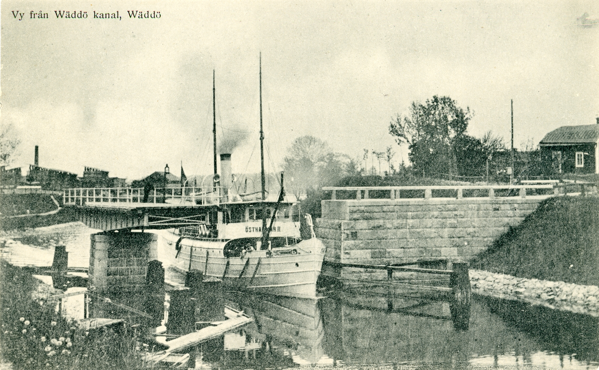 Titel: Brevkort adresserat till sjuksköterskan Amanda Palm. Motiv av vy från Wäddö kanal, Wäddö, med en båt med namn, Östhammar II, på väg genom kanalen. Text på baksidan: "Hjärtliga gratulationer på namnsdagen af Signe och Adolf".
