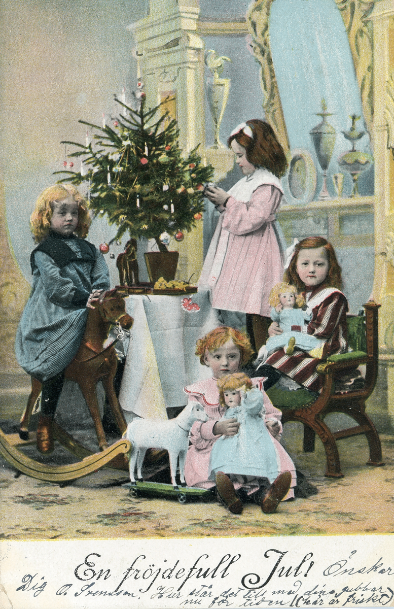 Text på framsidan: "En fröjdefull Jul! Önskar dig O. Svensson. Hur står det till med dina gubbar nu för tiden! (här är friskt)".
