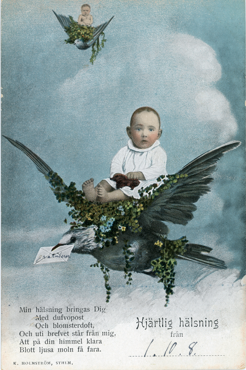 Brevkort adresserat till sjuksköterskan Amanda Palm, 1903. Motiv av ett barn som flygs av en brevduva med ett brev i näbben. K. Holmström, Sthlm.