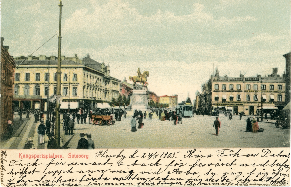 Titel: Brevkort adresserat till sjuksköterskan Amanda Palm. Motiv av Kungsportsplatsen i Göteborg. Text på framsidan: "Husby d 24/8 1905. Kära Fröken Palm! Tack för senast, å tack för besväret med brefvet hvilket upphann mig vid Åsbo, ty jag låg öfver i Sandviken första natten sedan jag reste ifrån Gefle. Fick inte resa för mina slägtingar. De varmaste hälsningar! L.F"."Hälsa Anna!"på tvären till vänster.