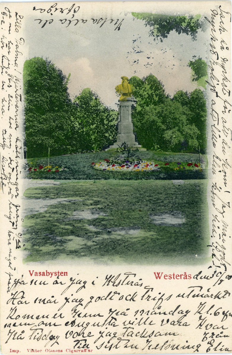 Motiv av Vasabysten i Westerås med blomplanteringar nedanför.