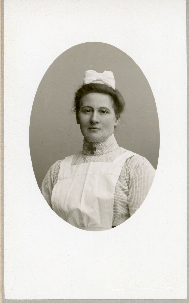 Titel:Porträtt av en kvinna i sjuksköterskeuniform.