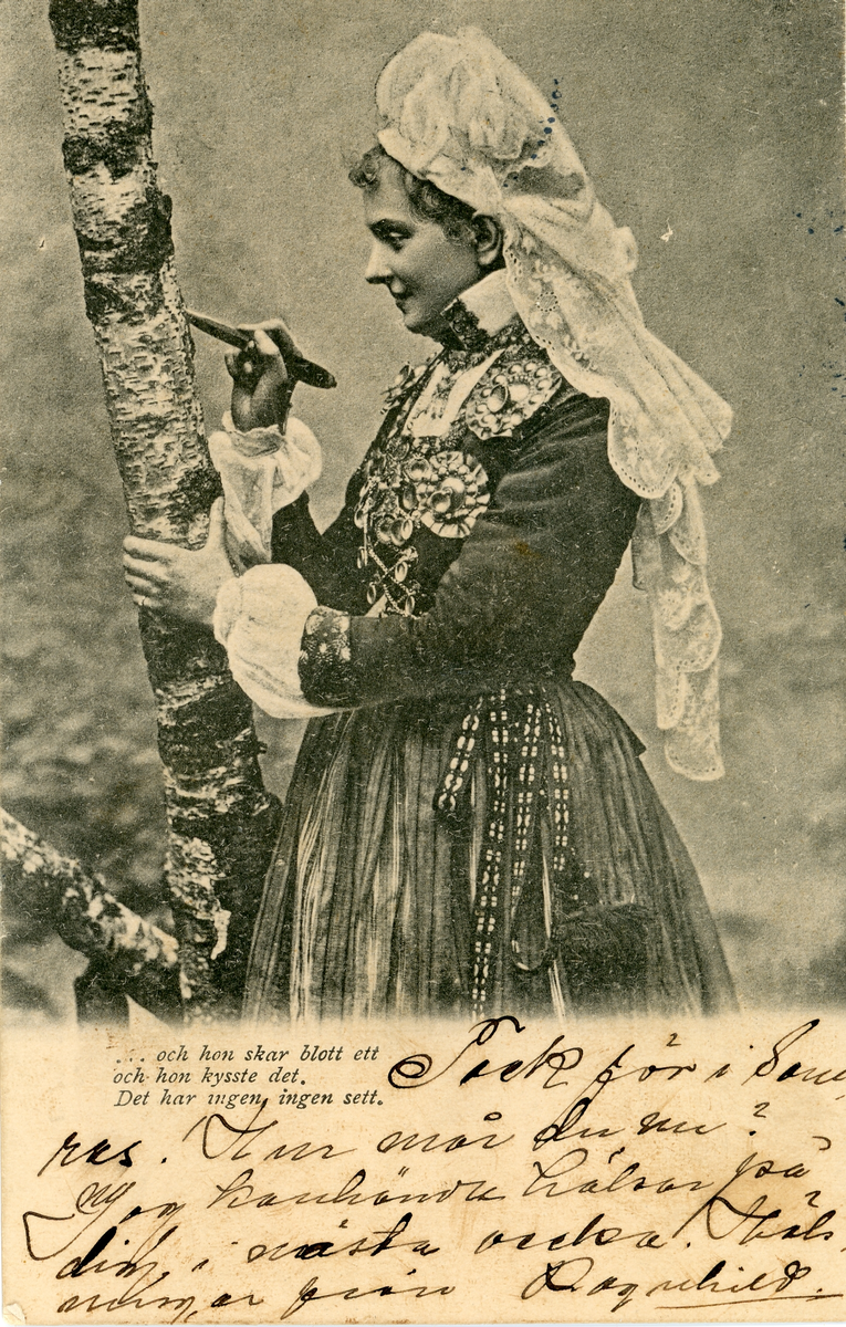 Titel: Brevkort adresserat till sjuksköterskan Amanda Palm, 1904. Motiv av en kvinna i folkdräkt. Text på framsidan: "Tack för i somras? Hur mår du? Jag kanhända hälsar på dig i nästa vecka. Hälsningar från Ragnhild".