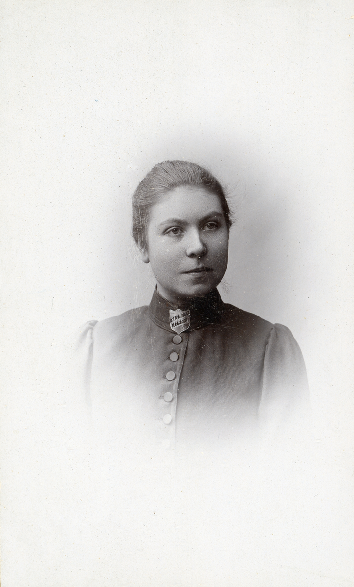Foto av en kvinnlig frälsningssoldat på ett utsmyckat kort med blommor.