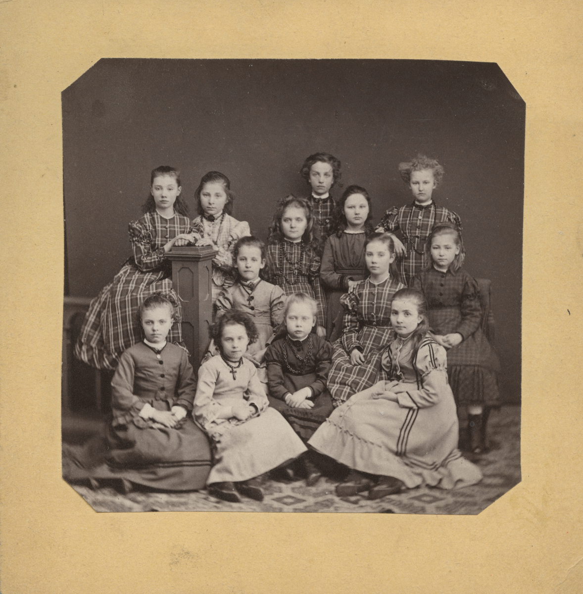 Text baksida kort: Svedlund. Klass 2 våren 1874. Några otydliga namninitialer samt Lydia H. och Tea Lindgren?