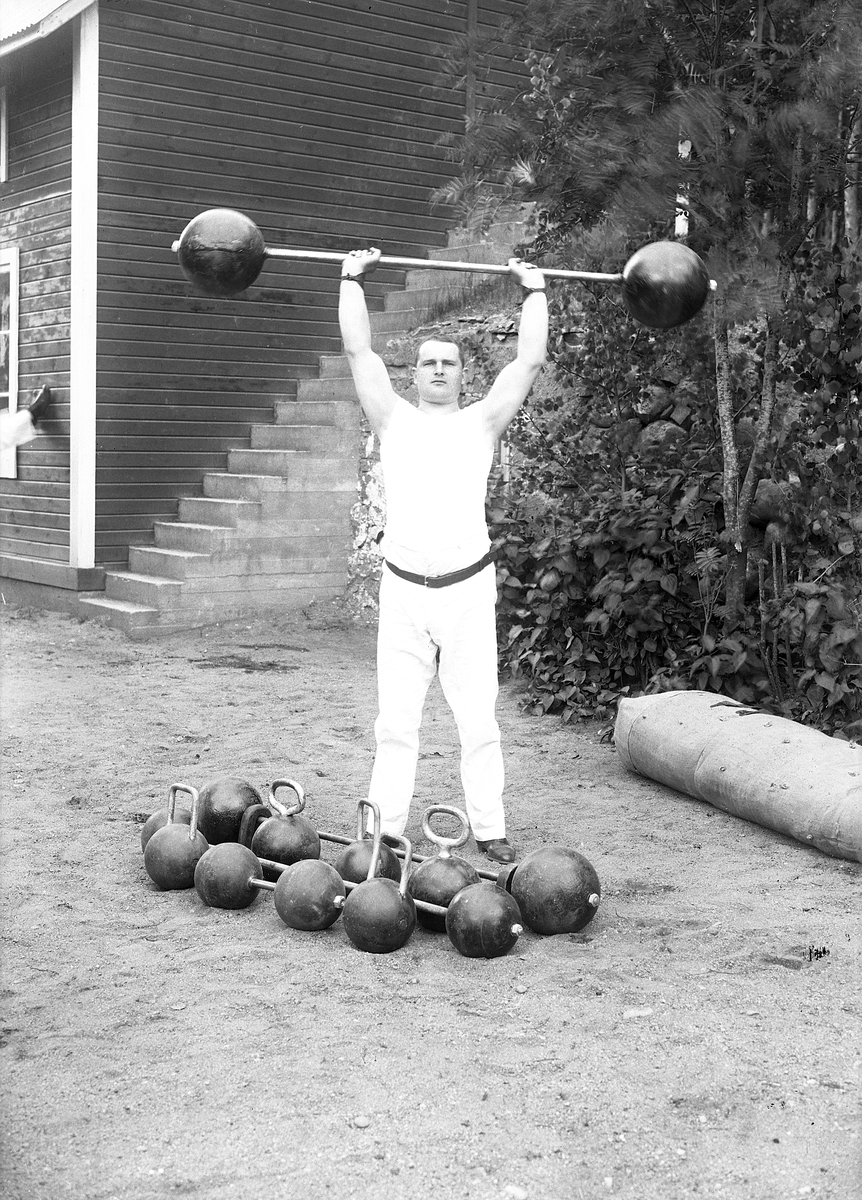 Kraftkarl ifrån atletklubben Heros poserar med viktstång av äldre modell försedd med klotformade järnvikter. Utomhus under tidigt 1900-tal.