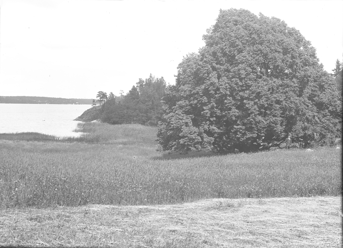 Landskapsvy mot vatten och en man vid skogsdungen. Tidigt 1900-tal.