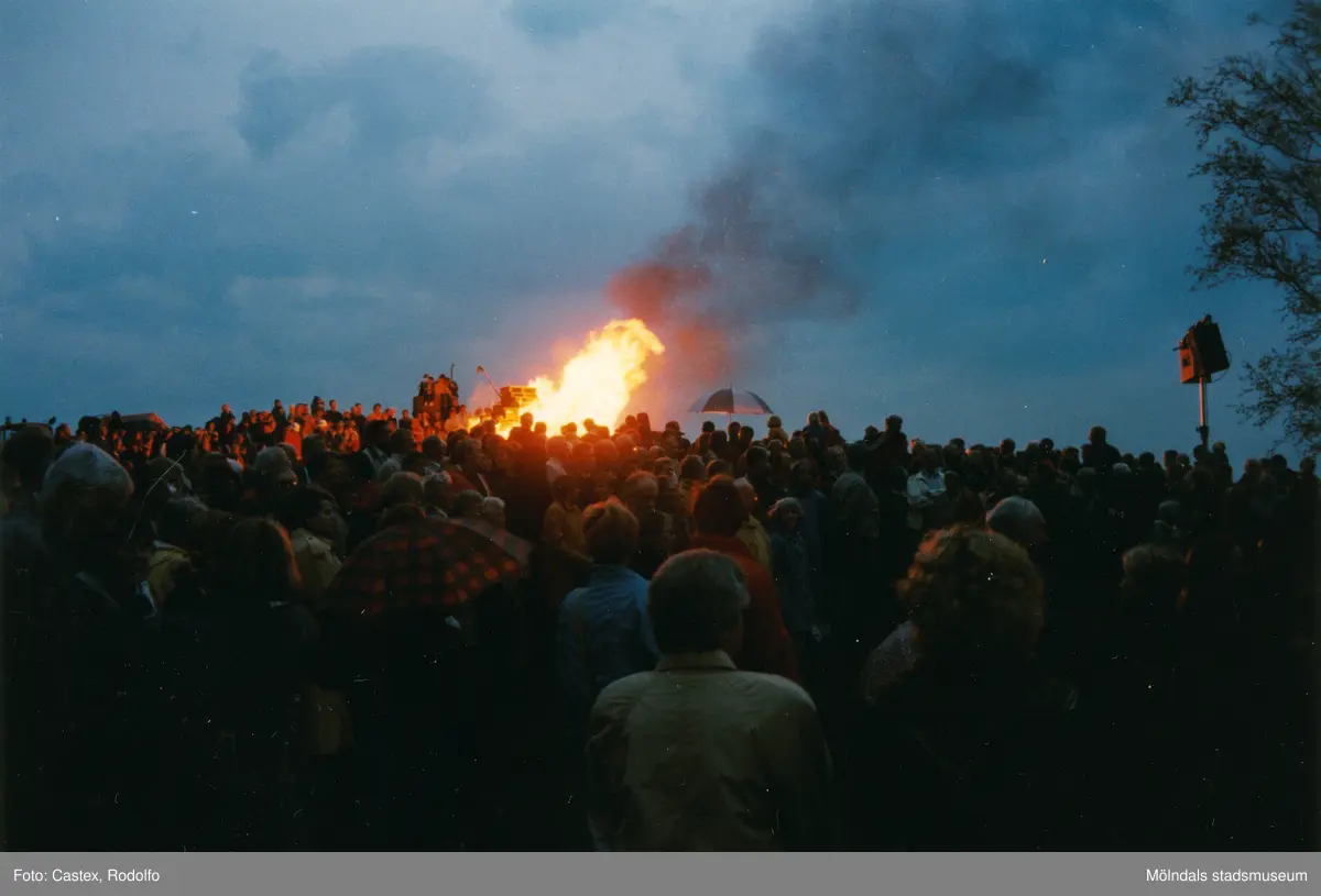 Firande på Störtfjället i Mölndal under valborgsmässoaftonen den 30 april 1998. Människor har samlats kring valborgsmässoelden.