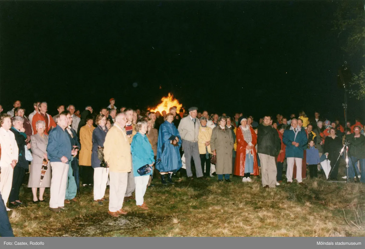 Firande på Störtfjället i Mölndal under valborgsmässoaftonen den 30 april 1998. Människor har samlats vid valborgsmässoelden.