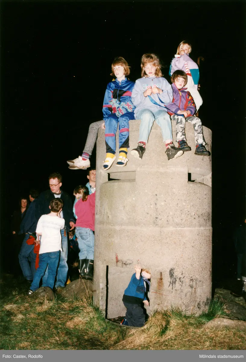 Titel: Firande på Störtfjället i Mölndal under valborgsmässoaftonen den 30 april 1998. Ungdomar vid bevakningstornet.