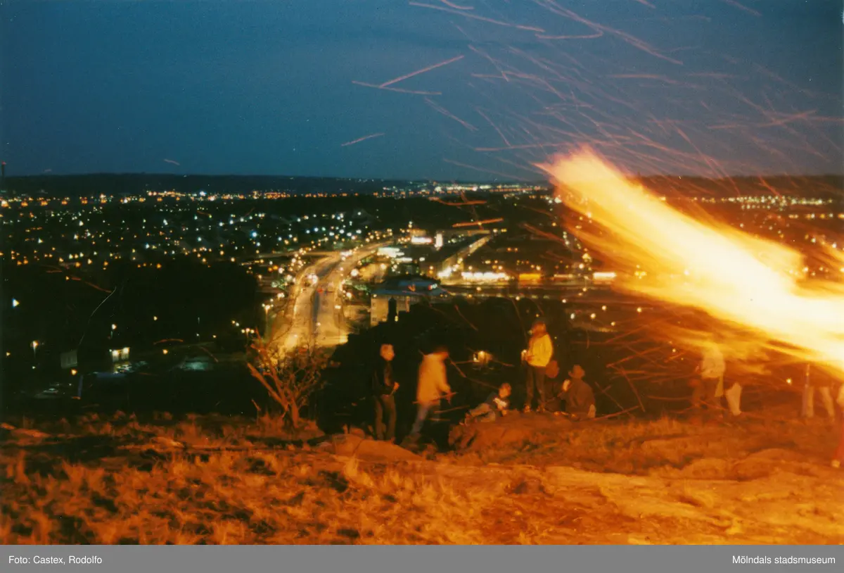 Firande på Störtfjället i Mölndal under valborgsmässoaftonen den 30 april 1998. Valborgsmässoelden med Mölndals bro i bakgrunden.