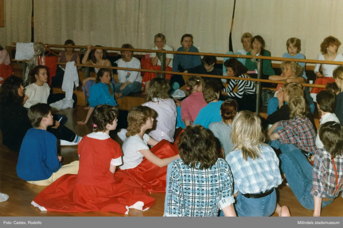 Titel: Högstadieelever övar inför uppsättningen av musikalen West Side Story. Spegelsalen i Aktiviteten/Idrottshuset i Mölndal, år 1986.