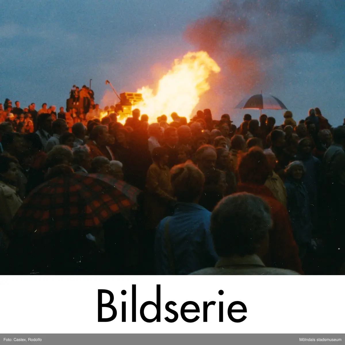 Serie om nio fotografier som visar firande på Störtfjället i Mölndal under valborgsmässoaftonen den 30 april 1998.