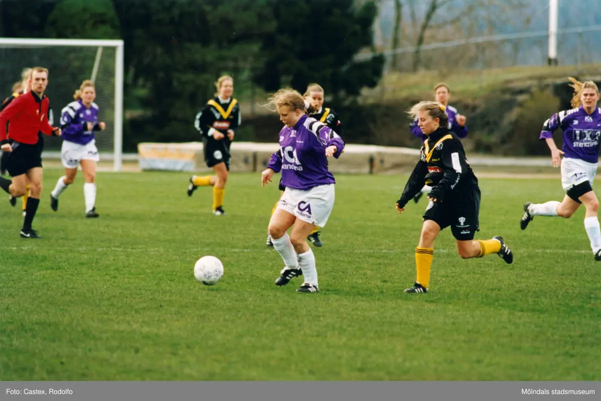 Titel: Fotbollslaget Jitex BK spelar match mot Bälinge IF på Kvarnbyvallen i Mölndal, år 1995. Slutresultatet är okänt.