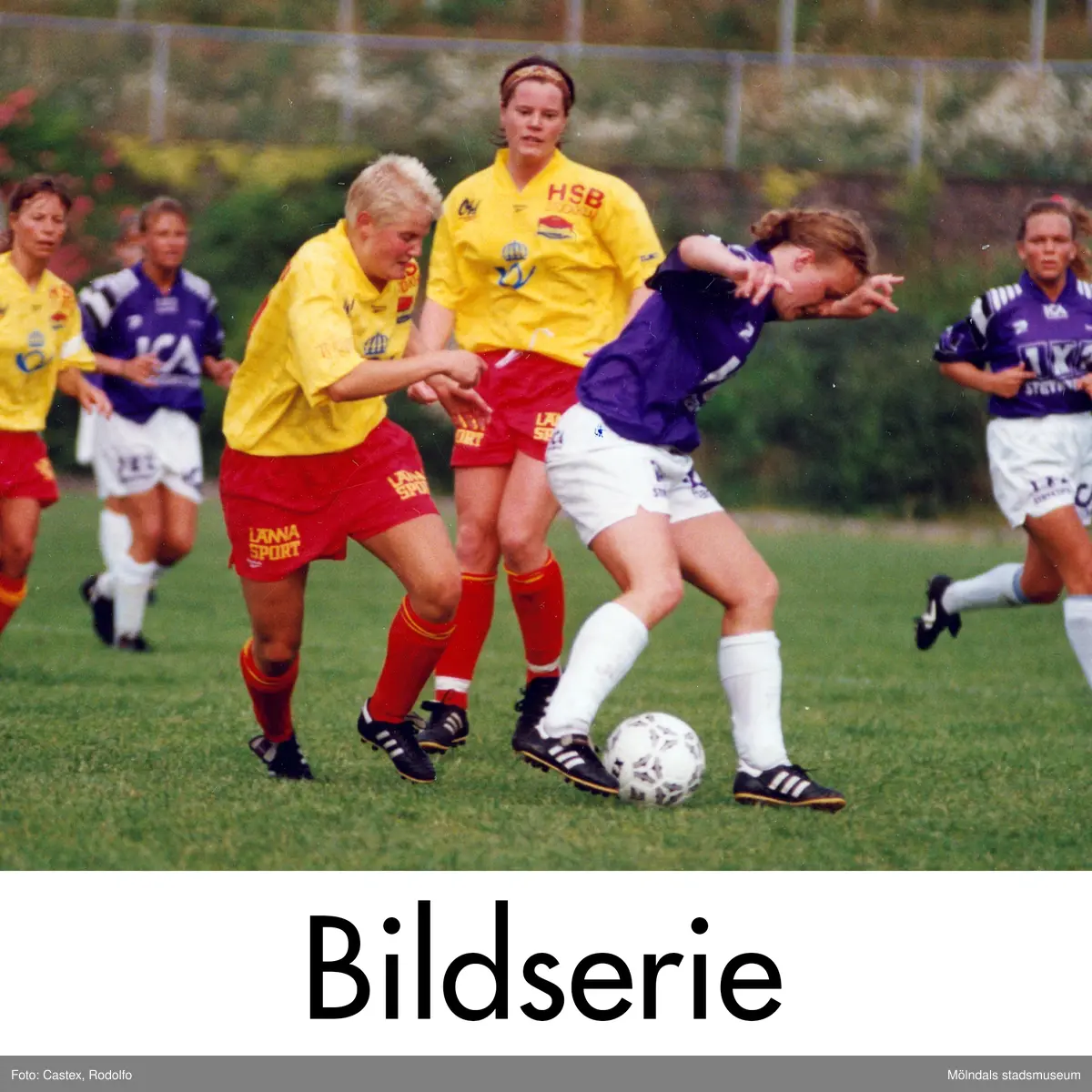 Serie om fyra fotografier som visar fotbollslaget Jitex BK spela match mot Tyresö FF på Kvarnbyvallen i Mölndal, år 1995. Jitex vann matchen med 4-2.