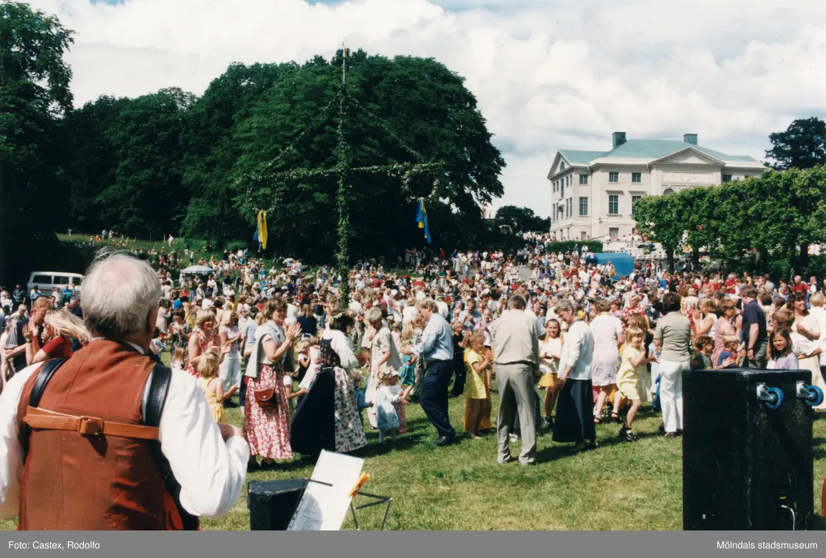 Midsommarfirande vid Gunnebo slott i Mölndal, okänt årtal. Dans kring midsommarstången. Slottet i bakgrunden.