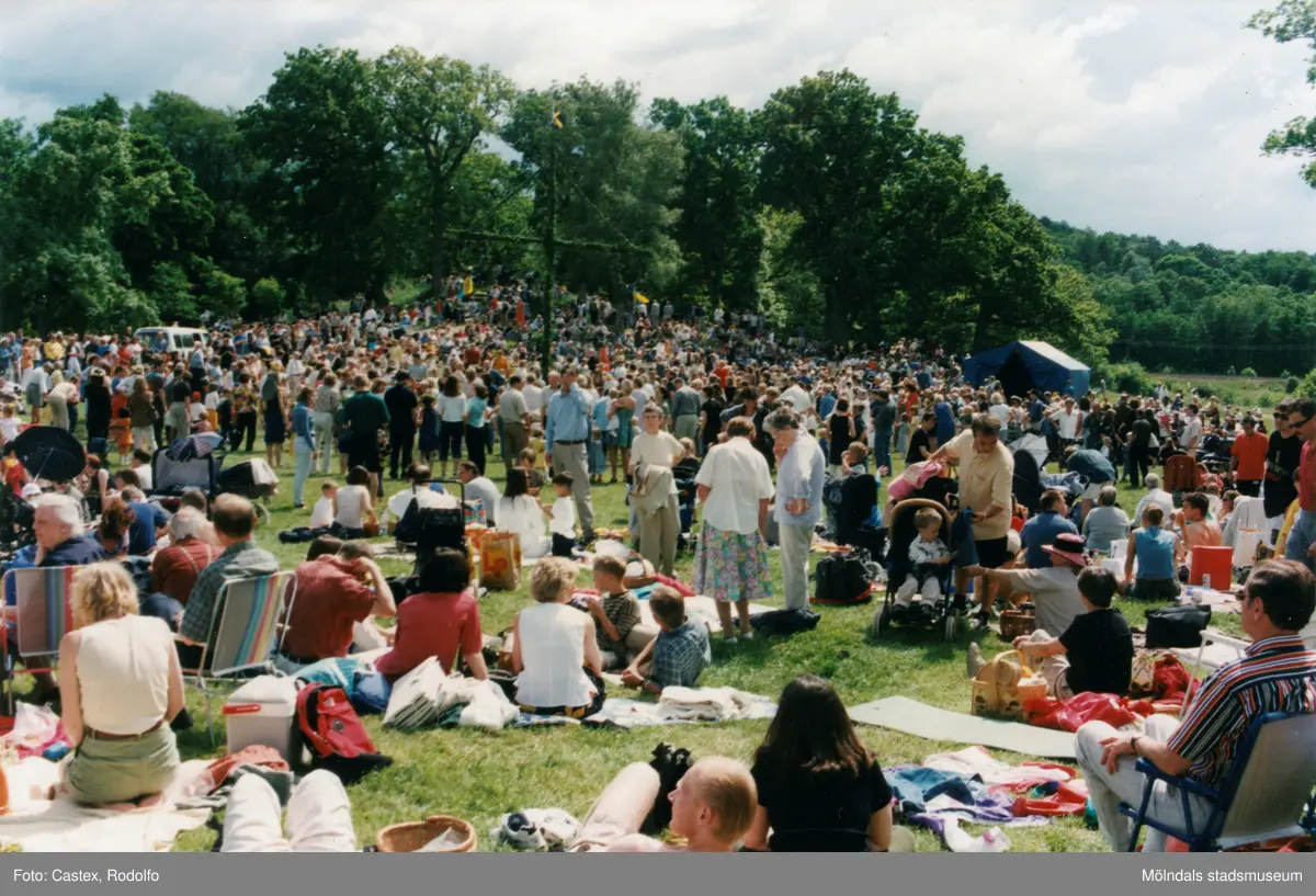 Midsommarfirande vid Gunnebo slott i Mölndal, okänt årtal. Dans kring midsommarstången.