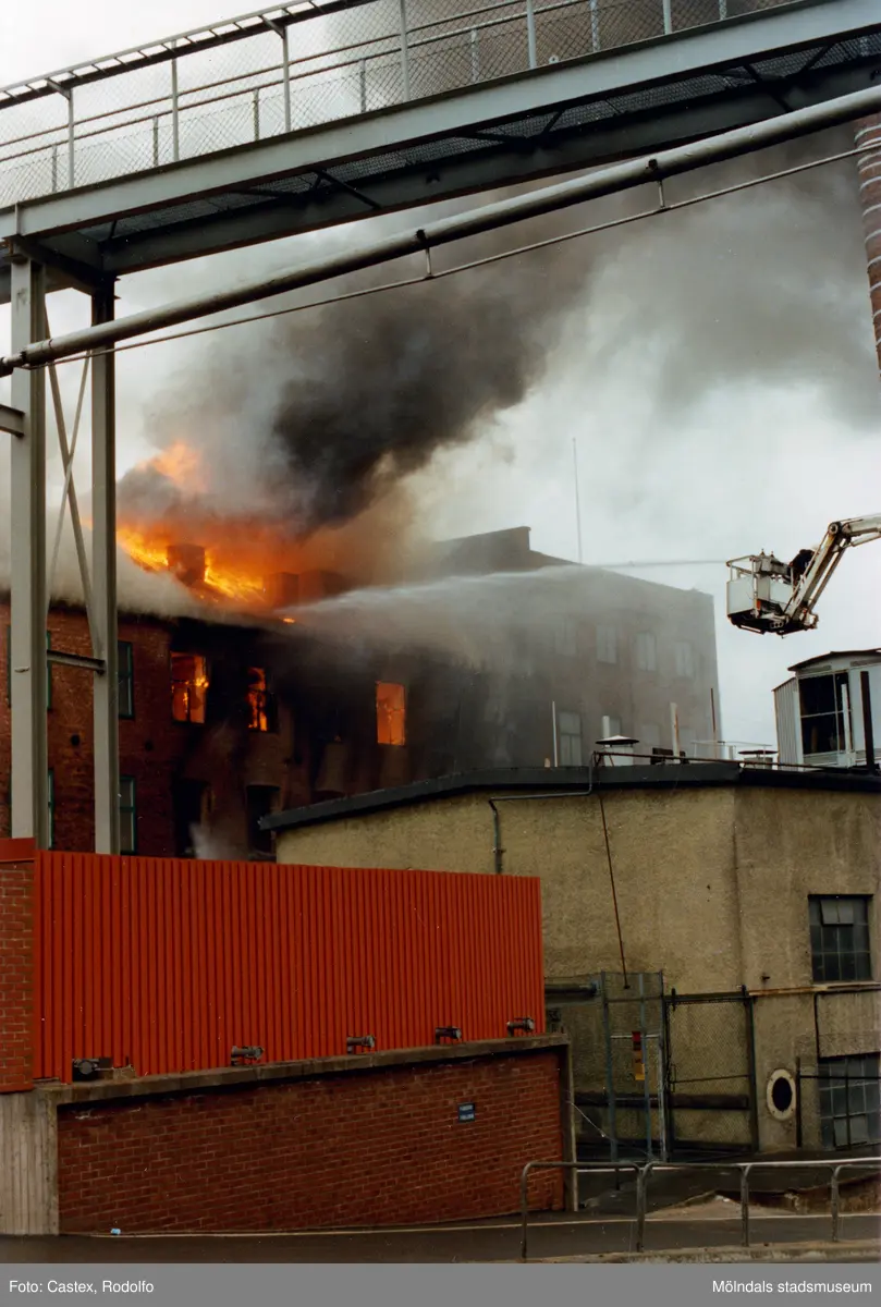 Branden i industribyggnaden Stora Götafors vid Götaforsliden i Mölndals Kvarnby den 4 juni 1986. Vy från Kråkan (Kvarnbygatan).