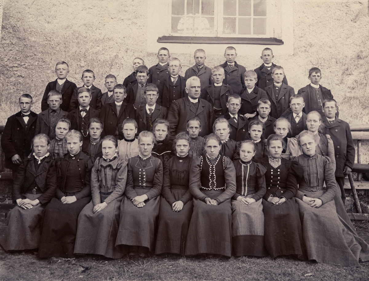 Gruppbild med unga flickor och pojkar, konfirmander eller skolklass. Fotograferat vid Ösmo kyrka.