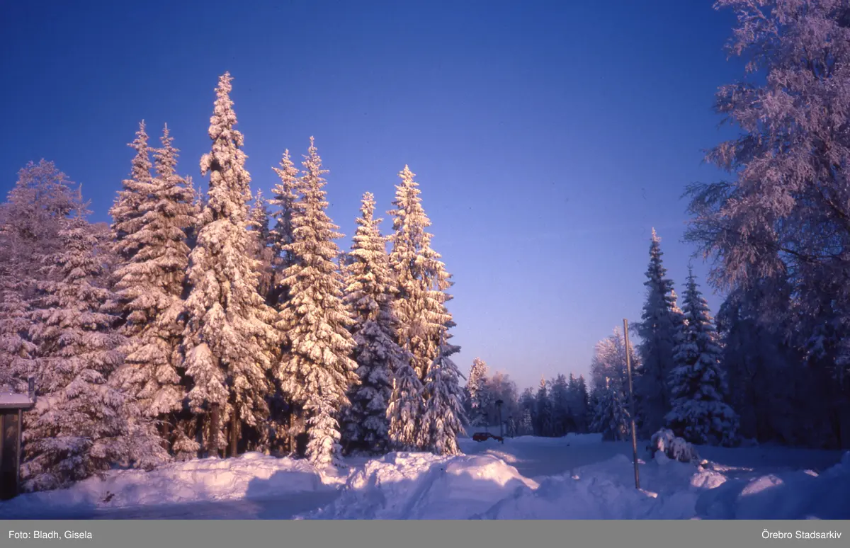 Snötäckta granar vid plogad väg i Kilsbergen, 1994