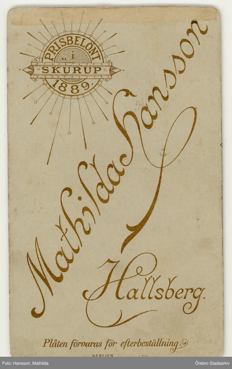 Baksida till visitkort från Mathilda Hansson, 1889