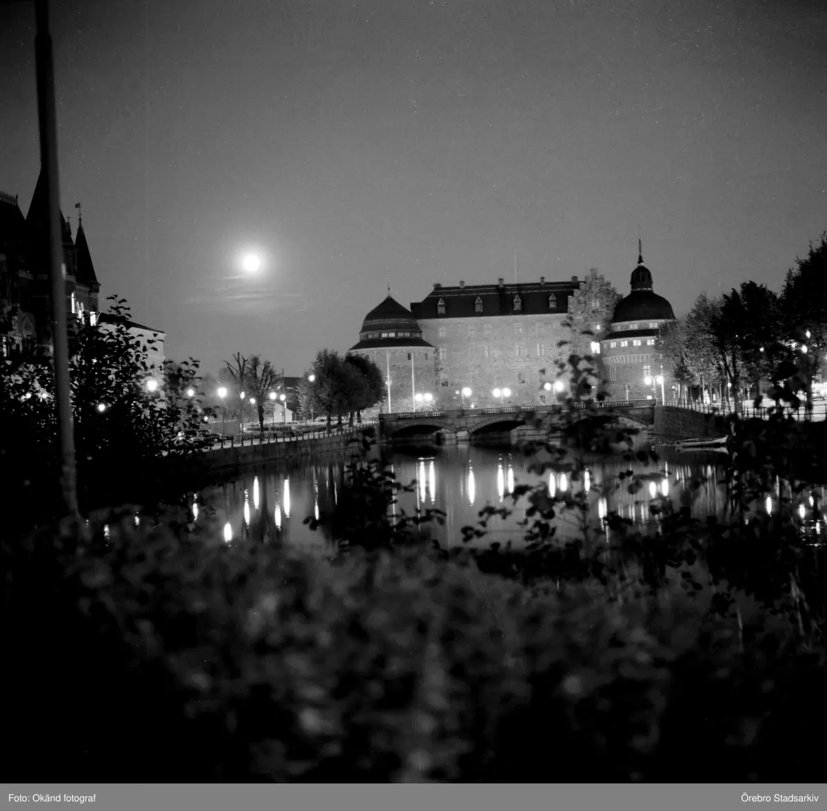 Belysningen på Storbron speglar sig i Svartån med Örebro Slott bakom sig, 1970-tal
