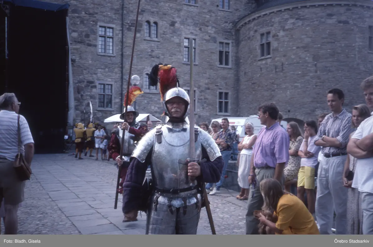Soldater i harnesk och plymförsedd hjälm vaktar på Örebro slott, 1994